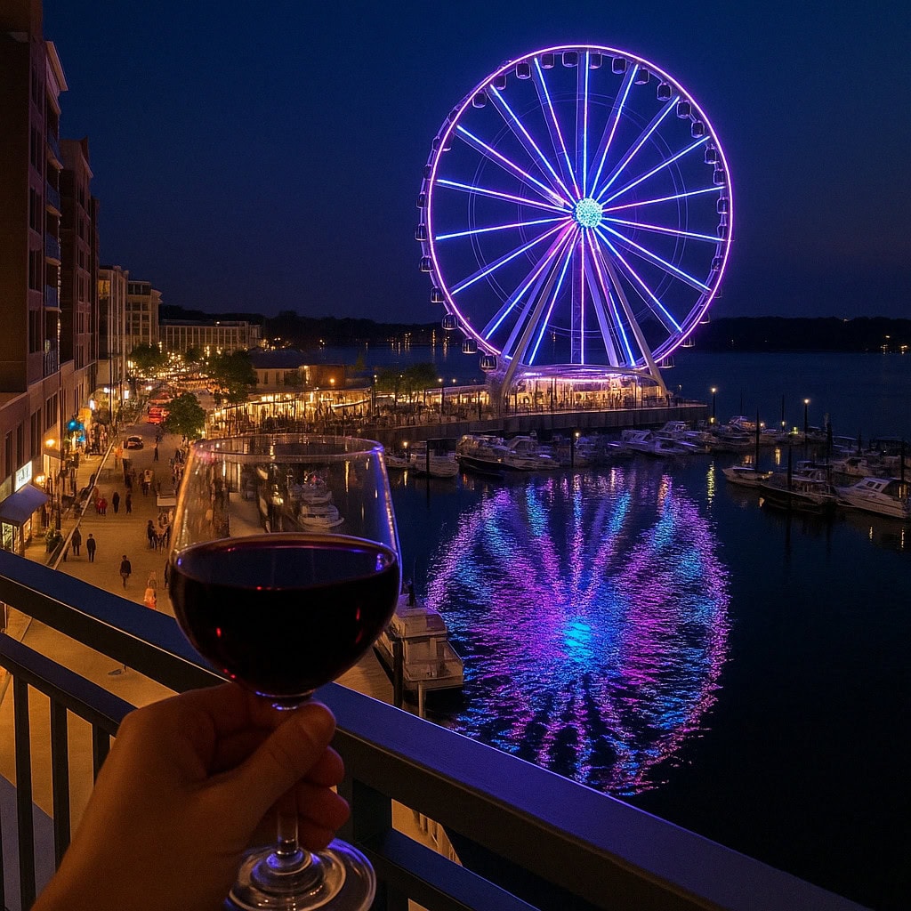 The lights of the Capital Wheel reflect off the water. The buzz of National Harbor hums nearby. And you didn’t even have to find parking.